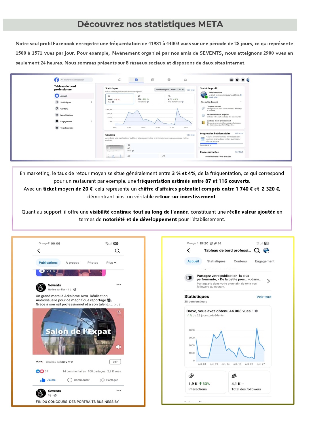 Votre vidéo sera également diffusée sur nos réseaux, bénéficiant d’une visibilité en constante progression, avec plus de 2 600 vues par jour (données META).